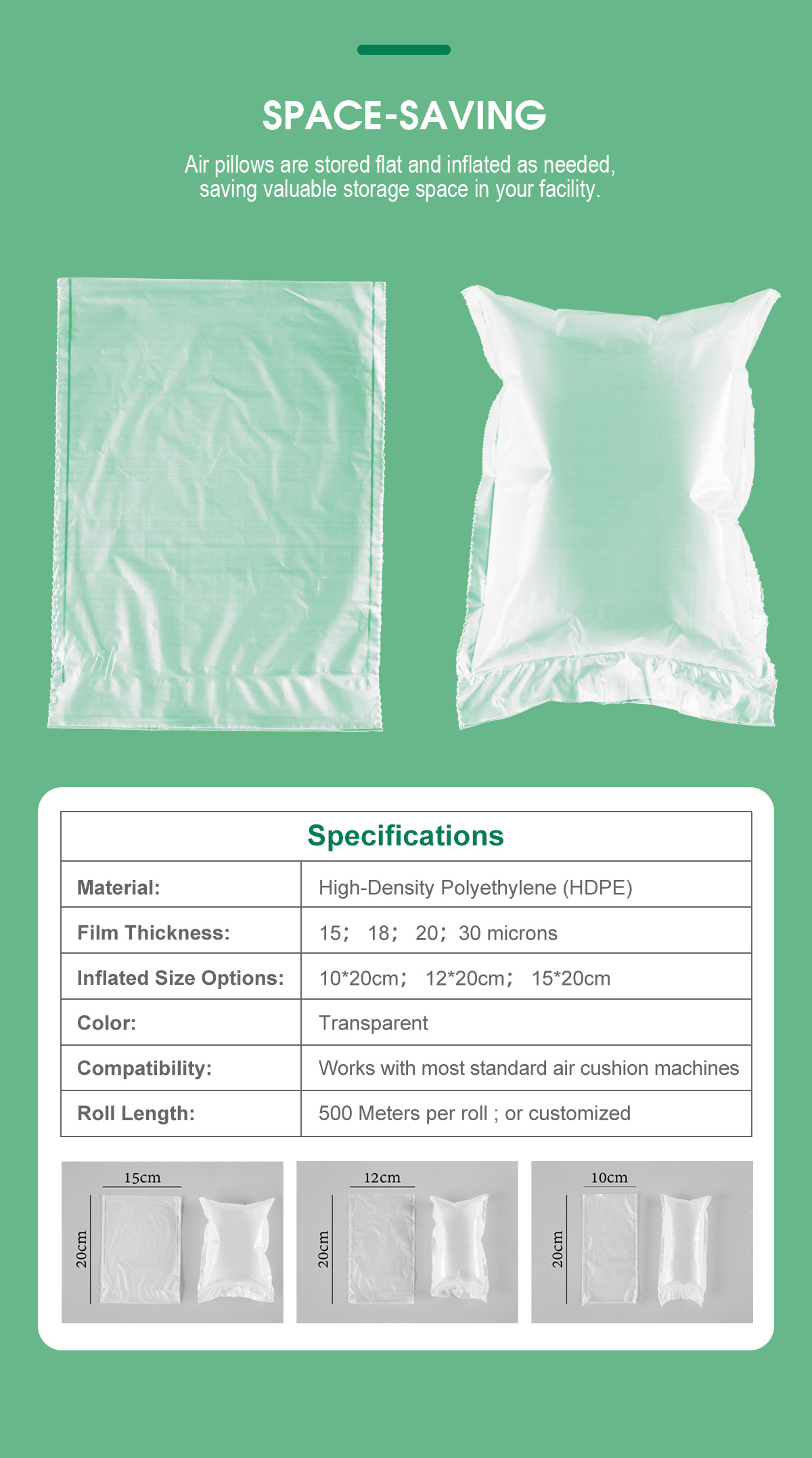 Space-saving Design: Air pillow packaging takes up minimal space when deflated, maximizing storage efficiency in warehouses and reducing storage costs.